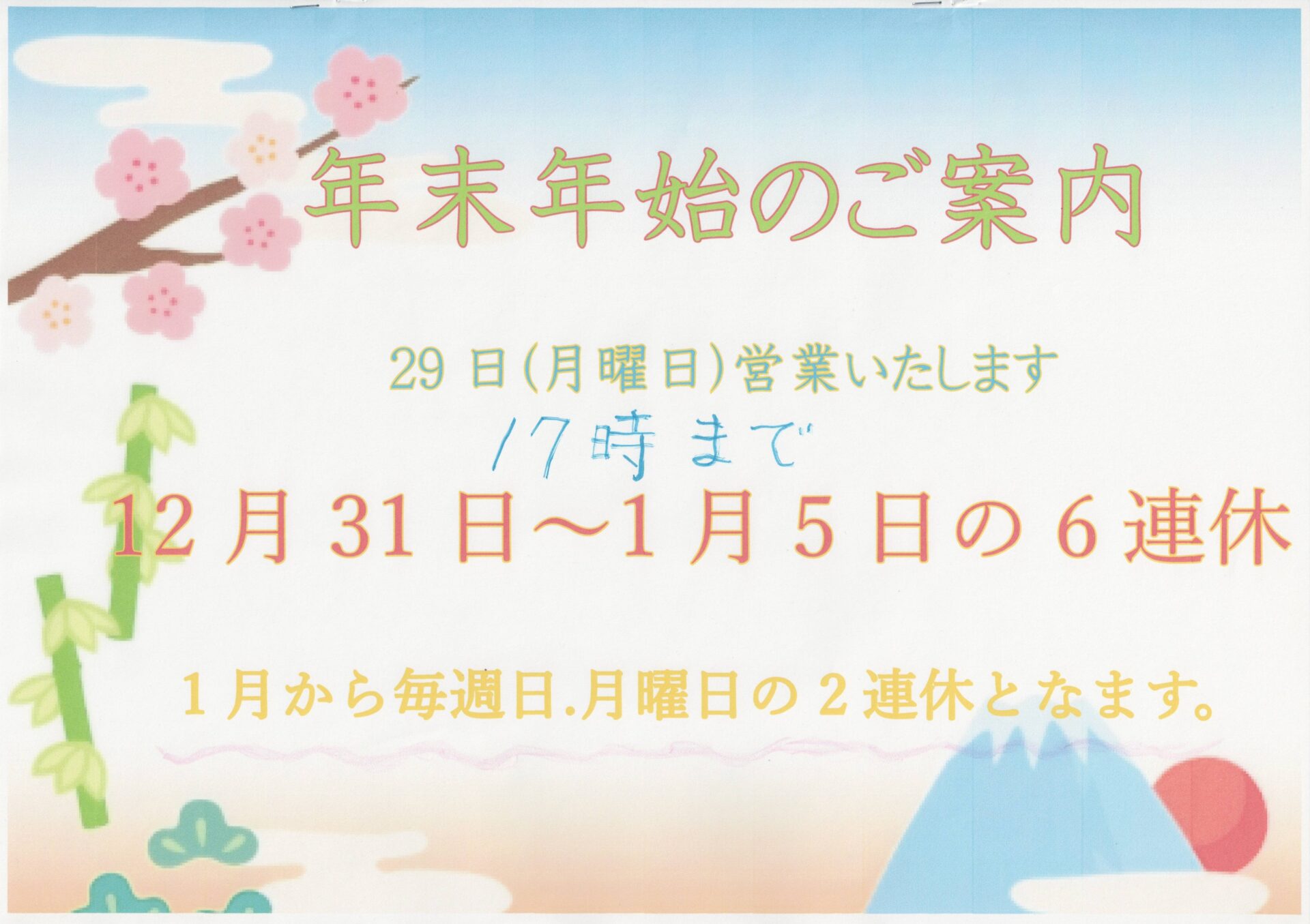 2025年11月19日 年末年始のご案内 投稿 11/19 in スタイルギャラリー, ブログ 年末年始のご案内 令和7年 12月29日月曜日臨時営業 17時まで 令和7年 12月31日(水曜日)から 令和8年1月5日までの6連休となります。 1月6日より営業いたします。 令和8年から毎週日曜日と月曜日が定休日となります。 ご不便おかけし申し訳ございませんが よろしくお願いいたします。 コアフユールまつお